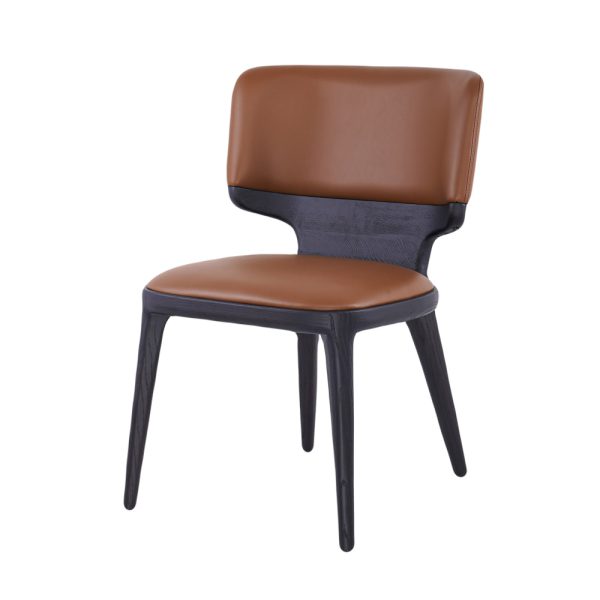 גב הכסא מכופף ומחבק משולב עץ וריפוד.