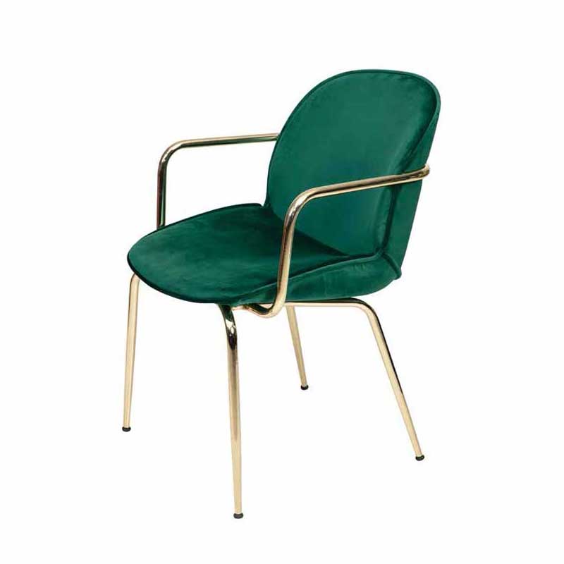 כסא עשוי יציקת גומי מרופד במגוון בדים עם ידיות ורגלי ברזל בגוון זהב ניתן להזמין בפליז מושחר ושחור