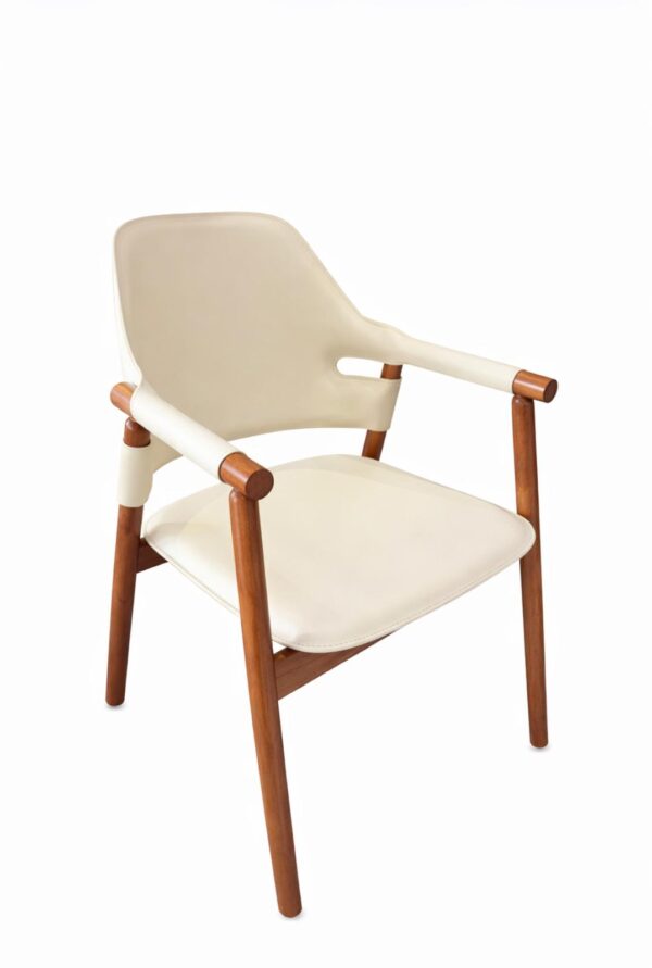 הכיסא מרופד בדמוי עור ניוד איכותי בגוון חמים, המעניק מראה יוקרתי וקל לניקוי, ומשתלב בצורה מושלמת עם שלד עץ מלא ויציב.