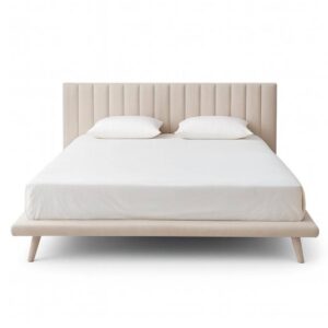מיטה מרופדת במלואה – גם מסגרת המיטה וגם הרגליים עטופות בבד אחיד בגוון בהיר (בז’/קרם), למראה הרמוני ורך.