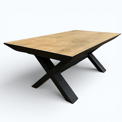 הבסיס בנוי מרגלי מתכת שחורות בגימור מט, בצורת X אלכסונית המעניקה לשולחן מראה דינמי ותעשייתי. המבנה ההנדסי מספק יציבות גבוהה לצד אמירה עיצובית מודרנית שמושכת את העין מכל זווית.
