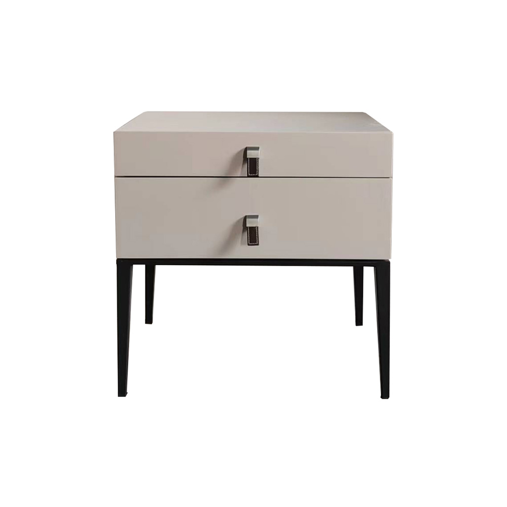 יש לה שני מגירות עם משטח עליון שטוח, והיא נתמכת על ידי ארבע רגליים דקות ממתכת שחורה.